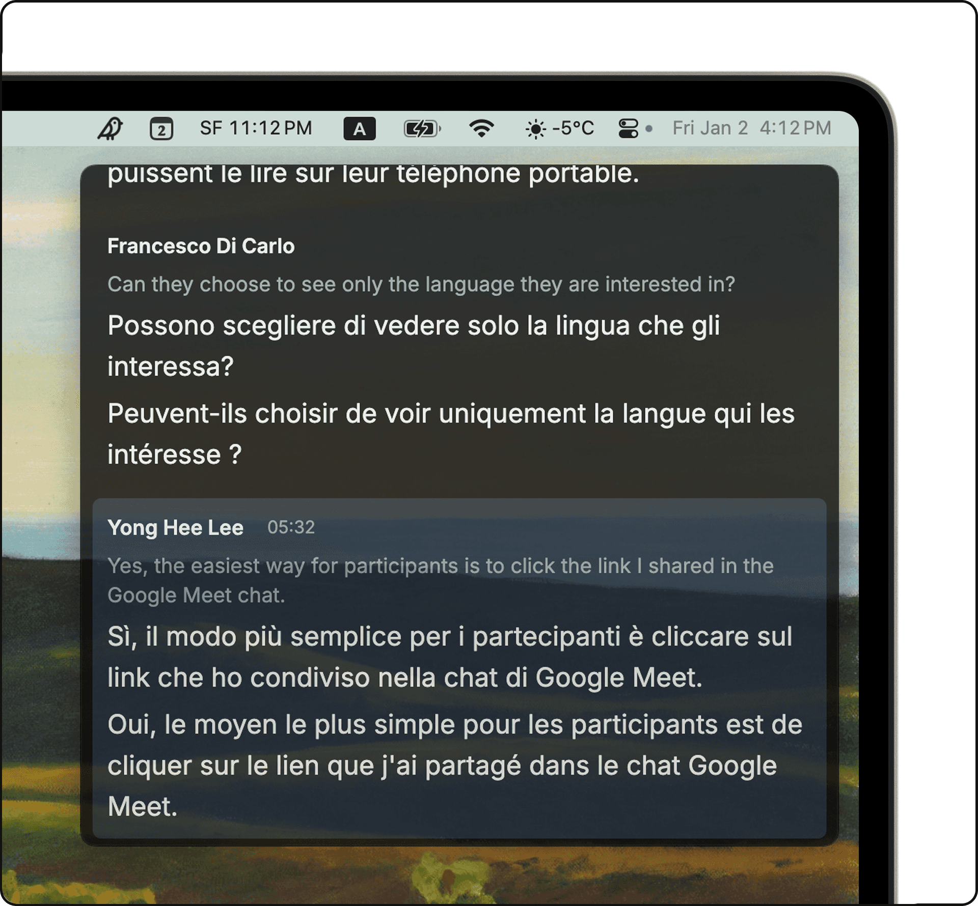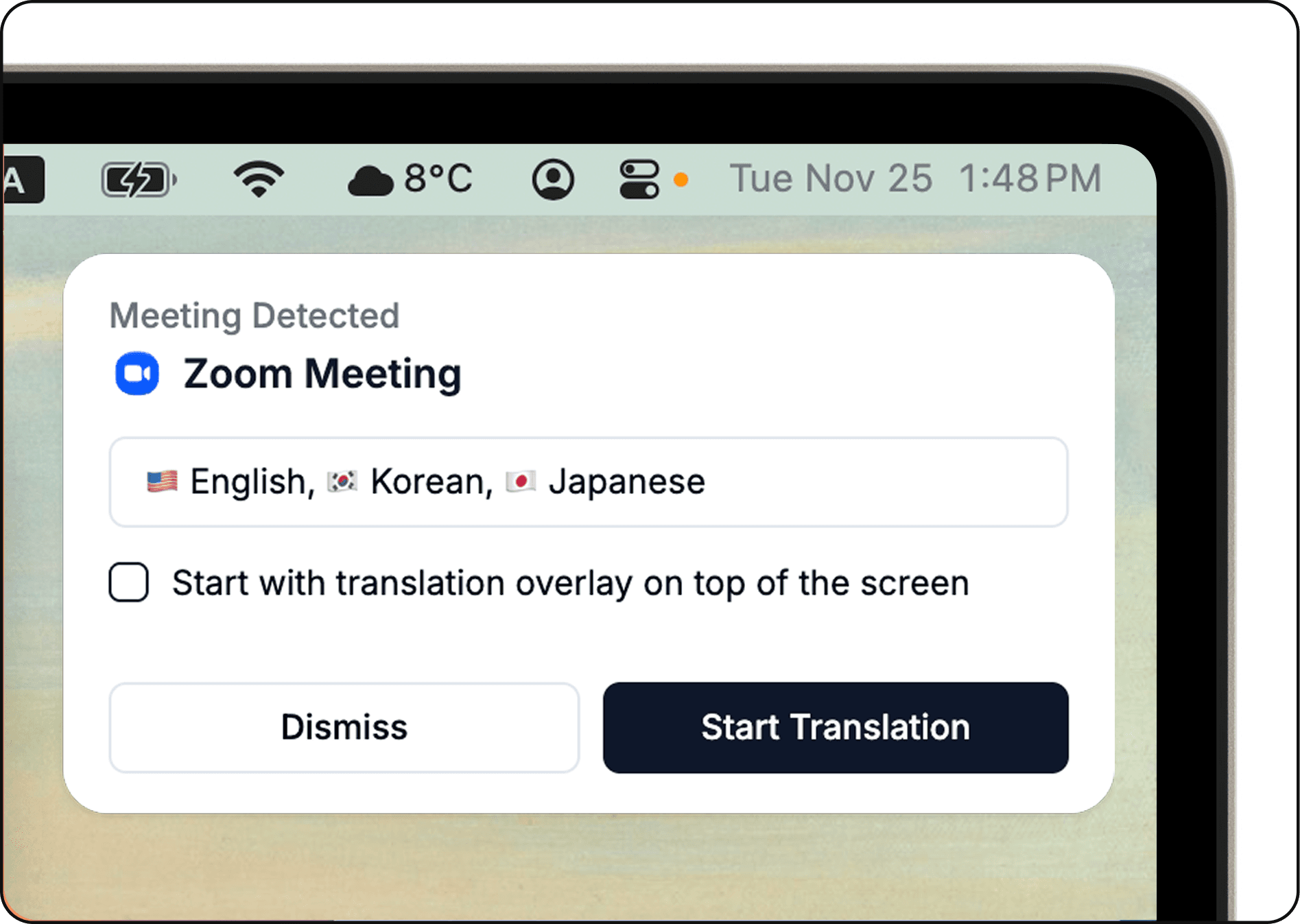 The desktop app includes quality-of-life improvements. You’ll get notified when a meeting starts, you can open Cuckoo instantly from the menu bar. You can also use a transparent translation window that overlays on top of any screen.