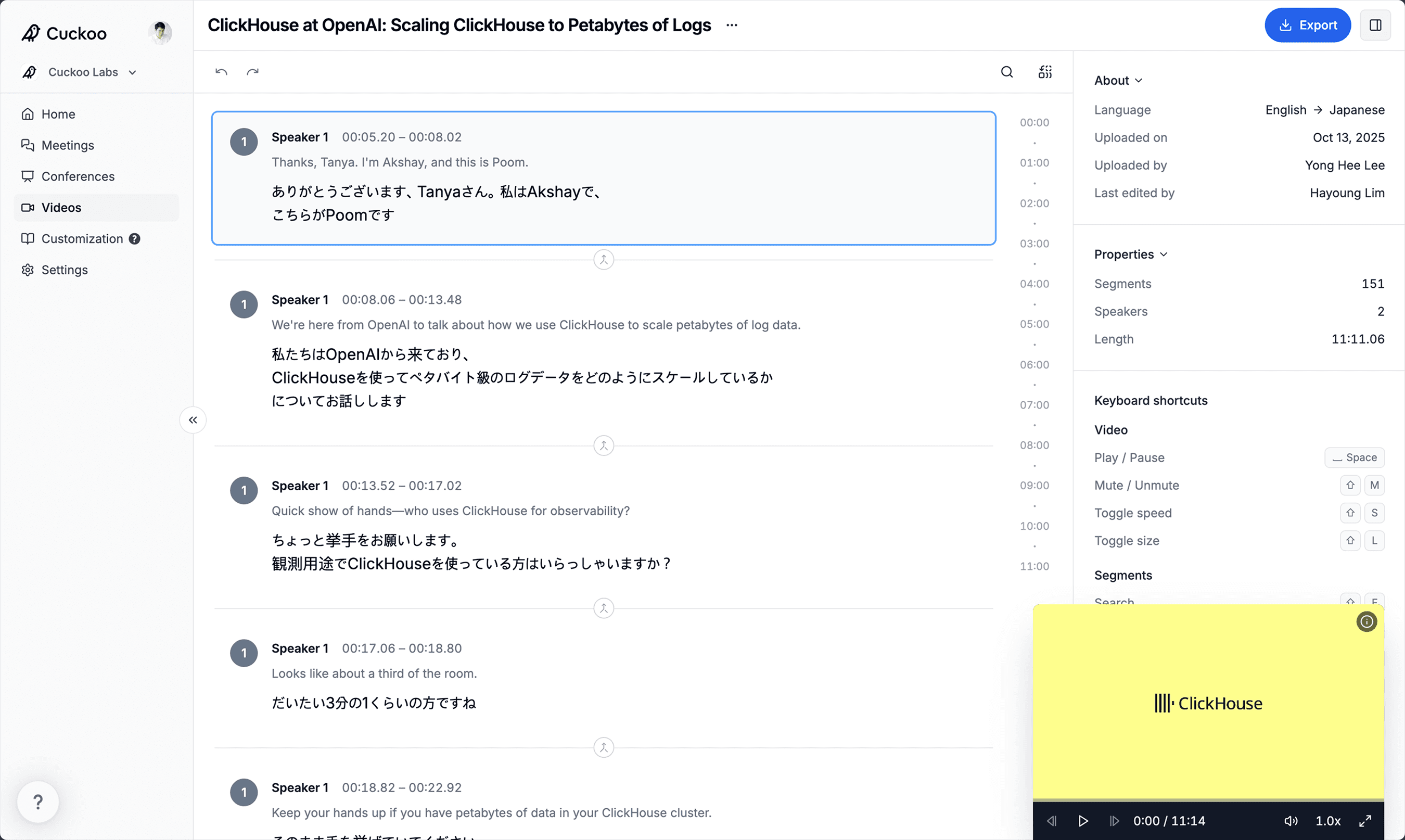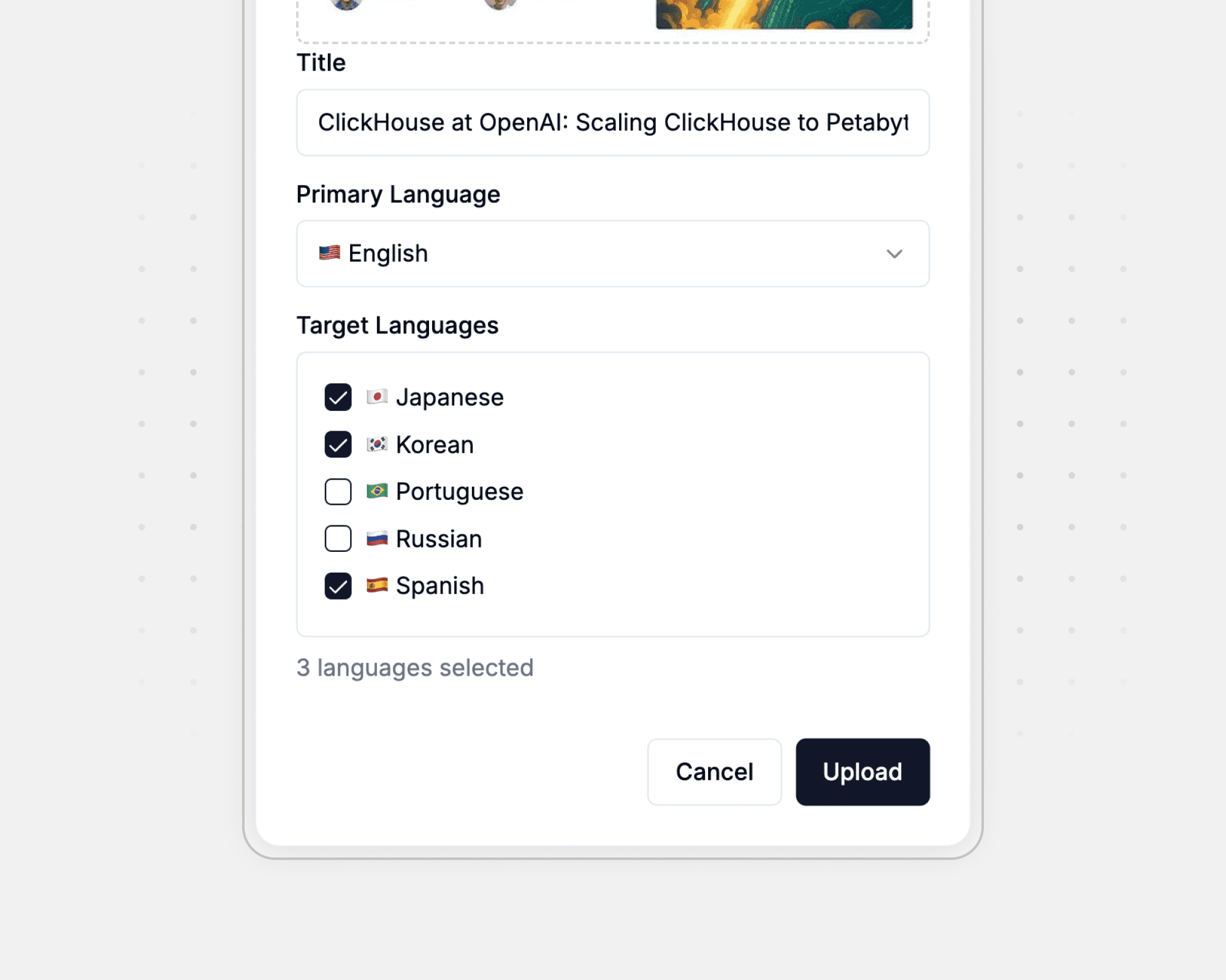 Upload long-form videos like webinars or conferences and choose from over 20 languages supported by Cuckoo.