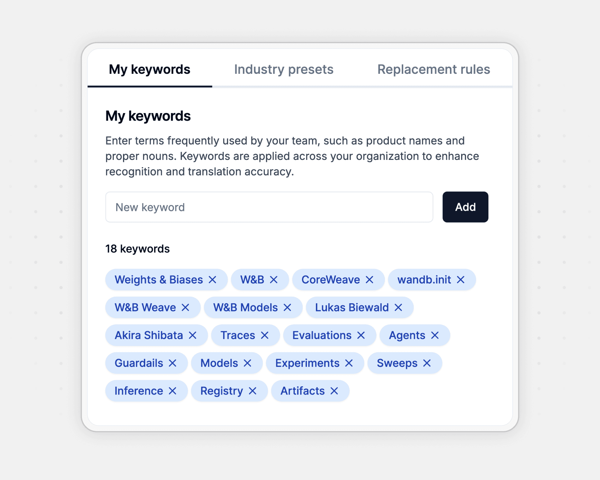 Add new keywords to your team dictionary so your future videos are translated more accurately and consistently.