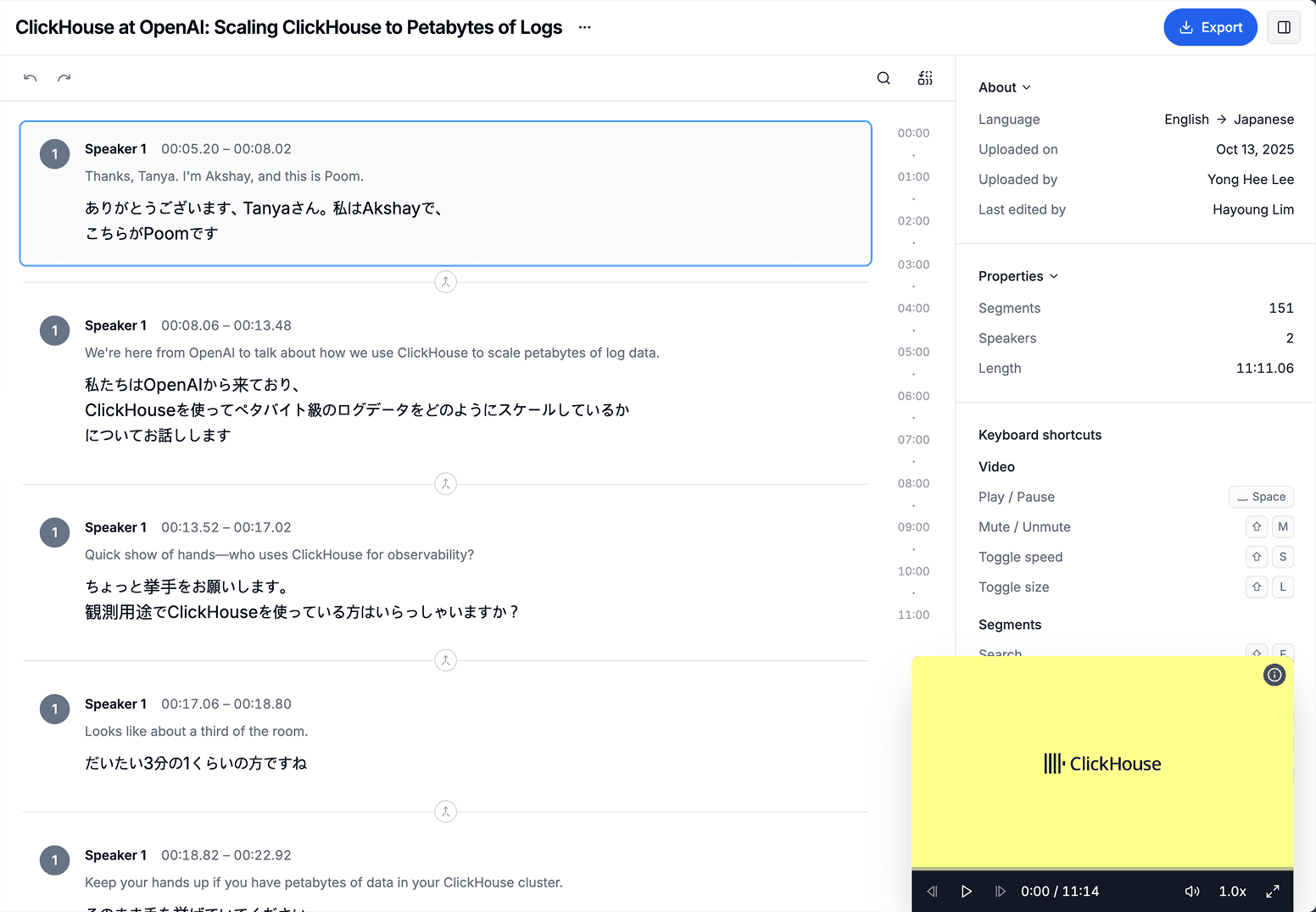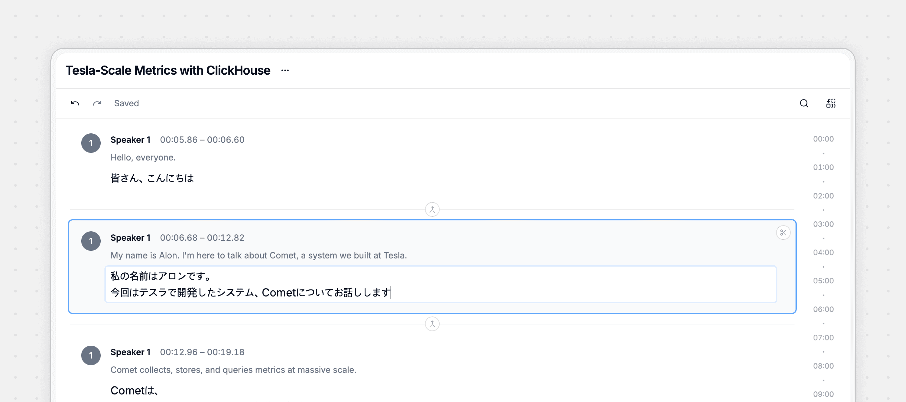 View translations in context with the original script, with quick access to timestamps and edit specific terms and phrases to match your preferred language and tone.