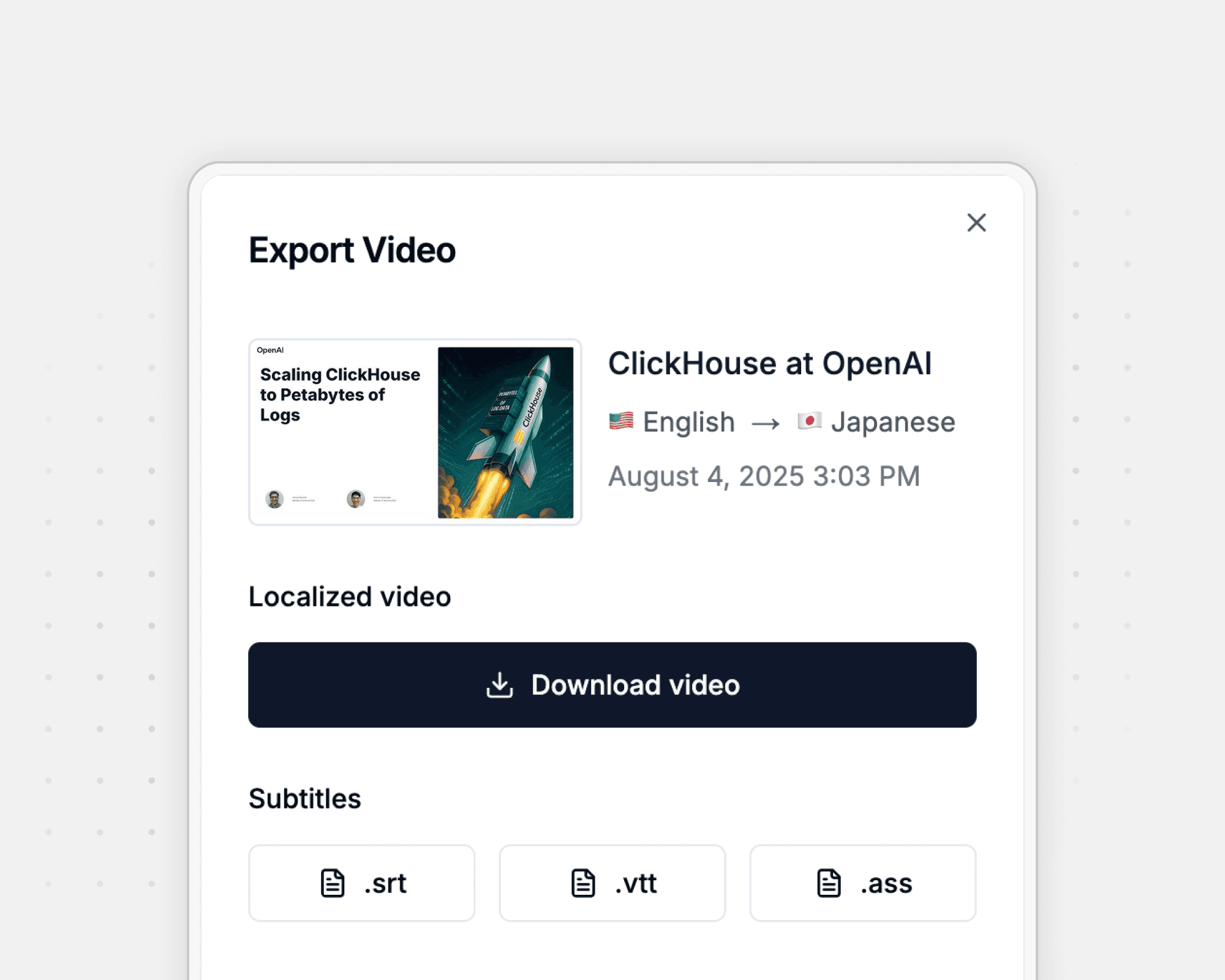 Burn subtitles directly into your videos in multiple languages and get publish-ready videos in minutes.